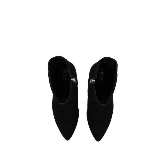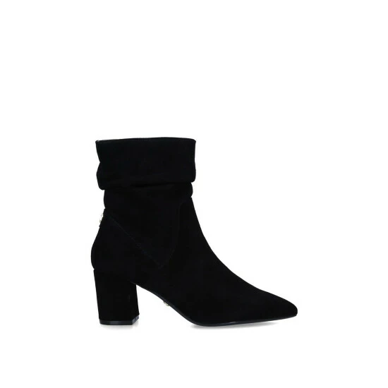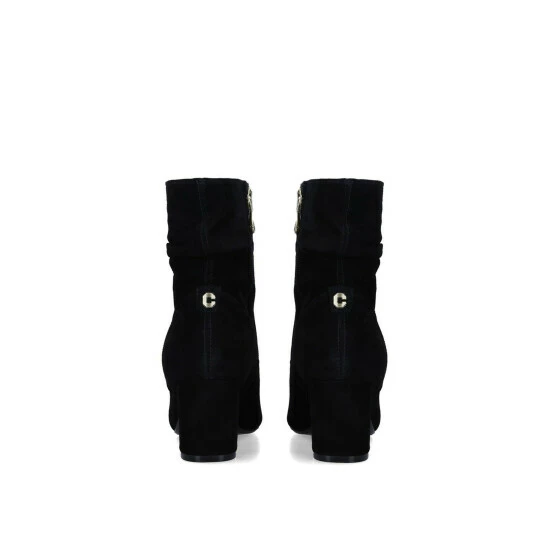 The Admire Low Slouch is an ankle boot in black suede. The ankle has a slouch effect with gold tone zip on the inner side. Heel height: 65mm
