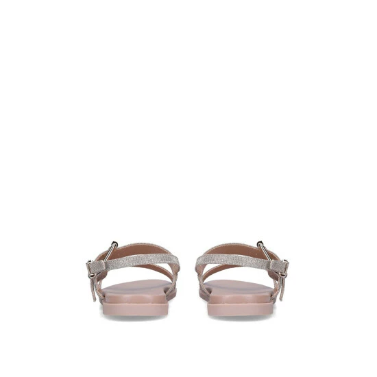 Add Berlin to your summer selection. This glitter flat strappy sandal features an adjustable heel strap with small gold buckle as well as larger buckle across the foot. The footbed is curved with rounded toe sat on a low black sole.