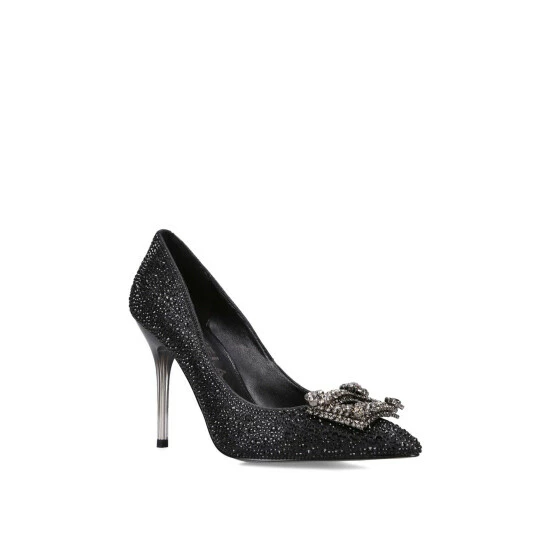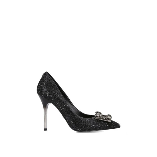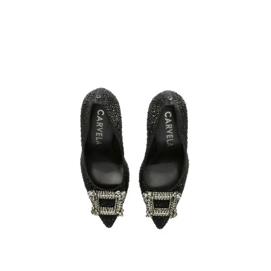 The Celebrate is a court style heel. The black upper is embellished in black crystals and features a smoked crystal hardware on the toe. The stiletto heel is in silver with an ombre effect.