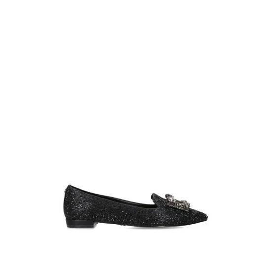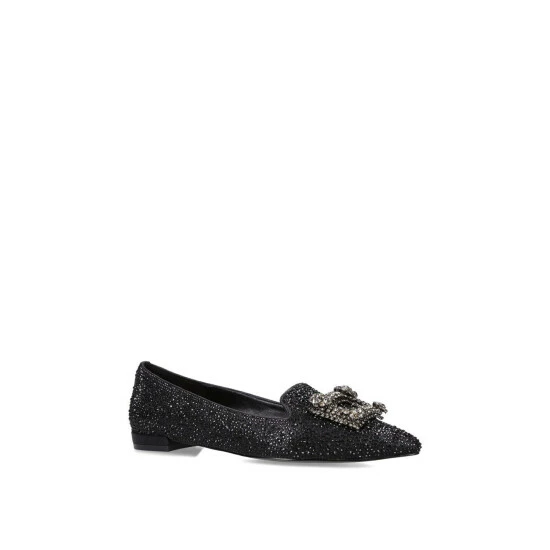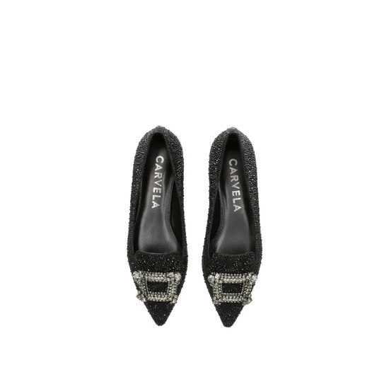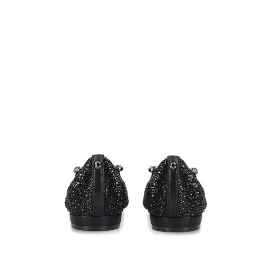 The Celebrate is a flat shoe. The upper is completely embellished with black sequins as well as a smoked crystal hardware on the toe, gunmetal C pin stud on the heel.
