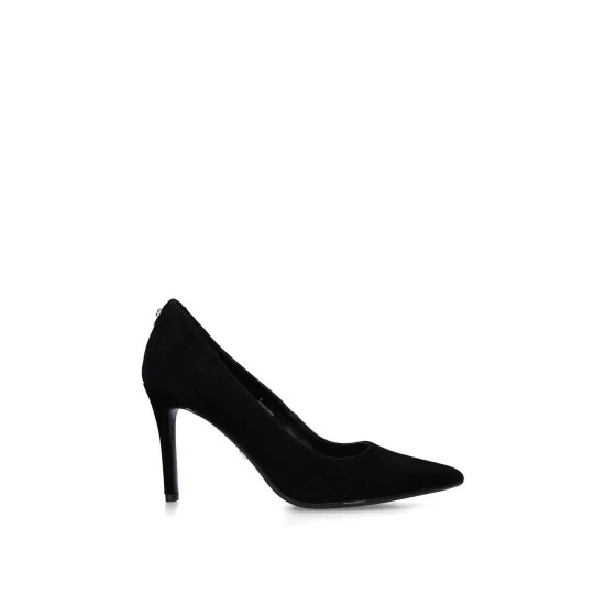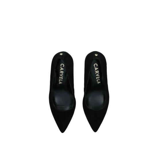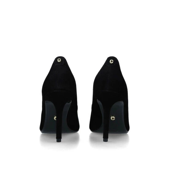 The Classique court heel arrives in a black suede leather. The back of the ankle features a micro gold Signature C pin. Heel height: 90mm.