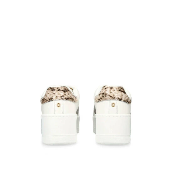 The Connected trainer features a leather upper in white. The front laces up with gold tone Carvela branded tab as well as snake print panels across the upper. The sole is extra chunky. Sole height: 55mm.