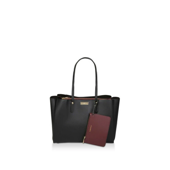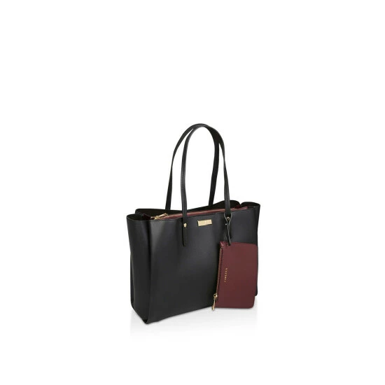 Prepare to fall for the multi-functional appeal of Freya Triple Compart Tote. Styled in a black hue, this tote is brought to you by Carvela with a spacious interior compartment and a cute zip-up wallet in wine looped around the handle.