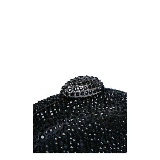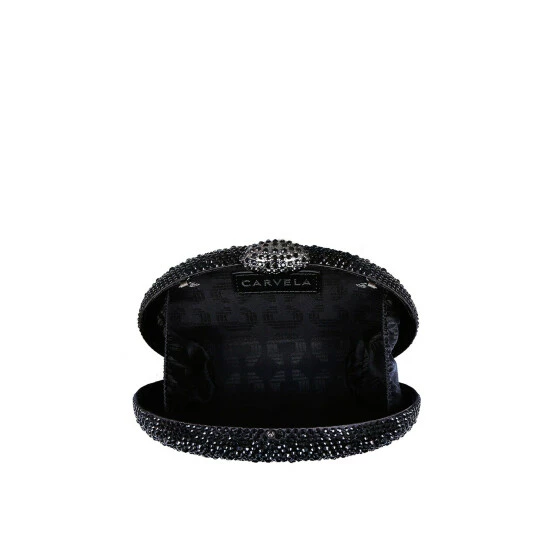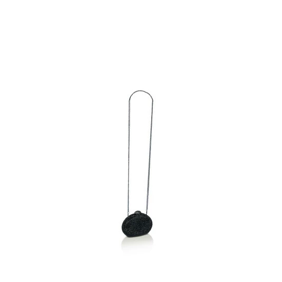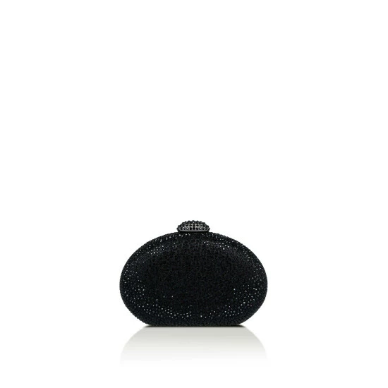 The Gleam Clutch arrives in a black fabric exterior that is embellished with crystals. The silver tone clasp closure also features black crystal. Dimensions, 10cm (H), 16cm (L), 4cm (D).
