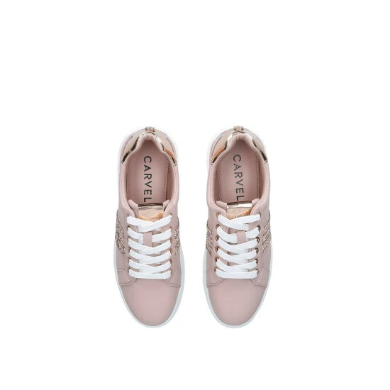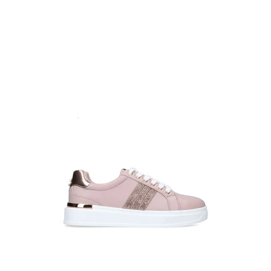 With a blush pink upper, the Glitz sandals feature three stripes on the sides topped with gemstones. The back of the ankle has two metallic panels topped with a rose gold Triple C stud. The front is laced up with rose gold eyelets.