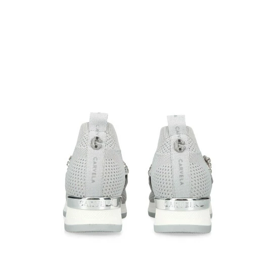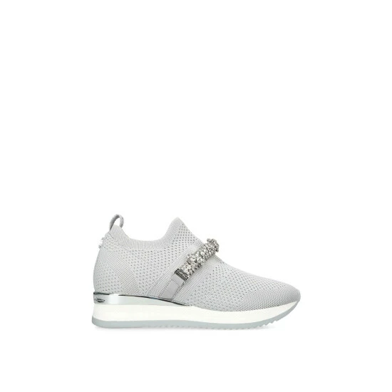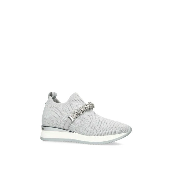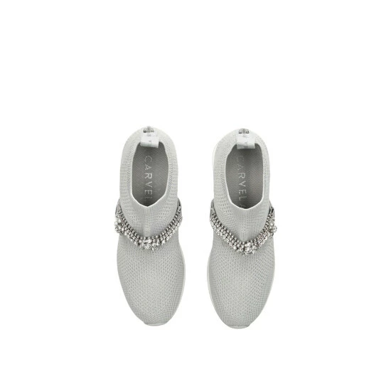 The Janeiro Jewel features a grey knit upper with slip on ability. The front features a crystal embellished strap whilst a silver branded panel is at the heel.
