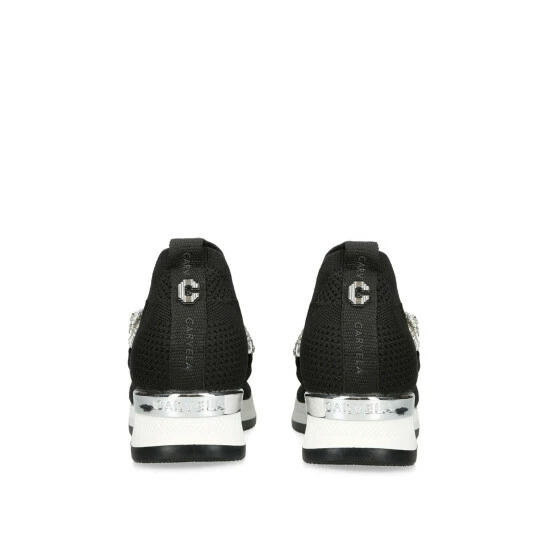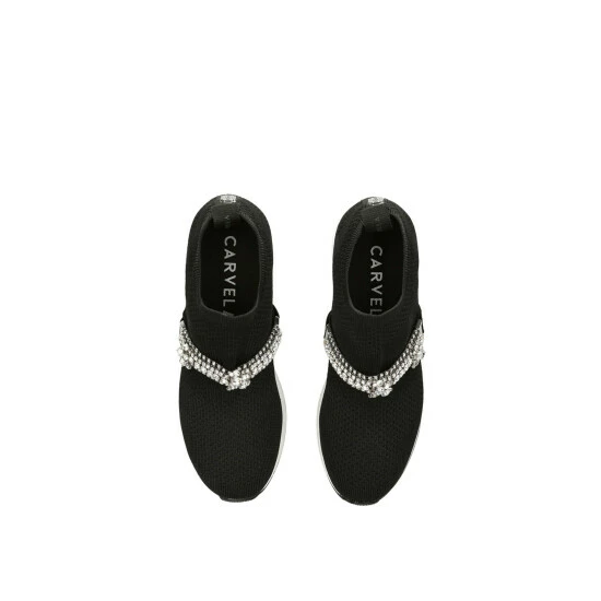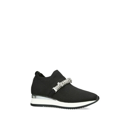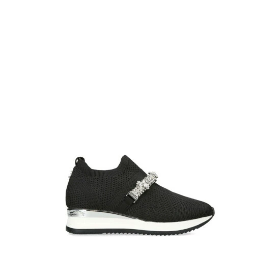 The Janeiro Jewel features a black knit upper with slip on ability. The front features a crystal embellished strap whilst a silver branded panel is at the heel.