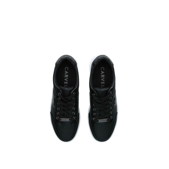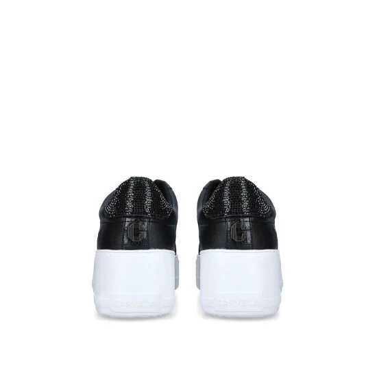 The Jive Lace Up from Carvela features a black detailed upper with a silver branded tab on top. The heel features a black glitter panel with a white chunky sole.