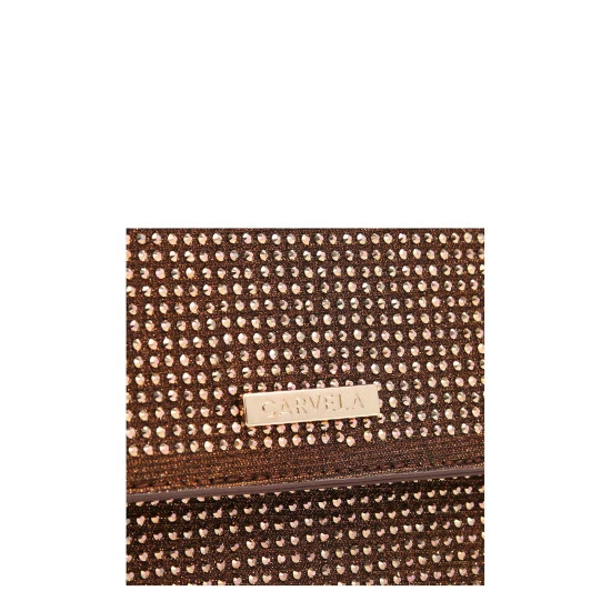 The Kianni Clutch features a stunning jewelledexterior in copper. The front features a gold tone branded panel with magnetic closure.