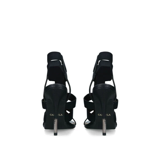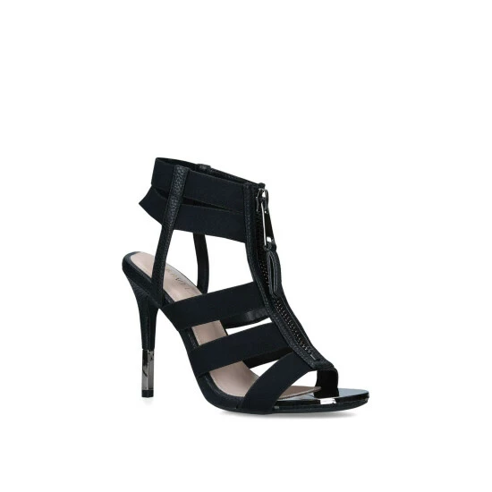 The Kunning heels are a black heel with elasticated straps enclosing the foot with an oversized black zip on the front and complimenting metal toe detail on the rounded toe. The 110mm textured heel features a brushed silver detail.