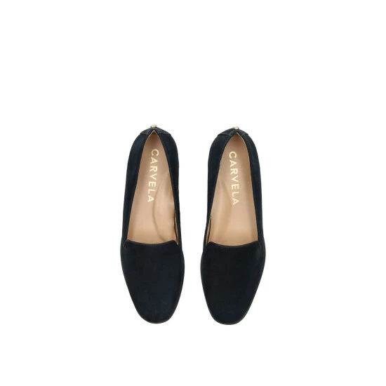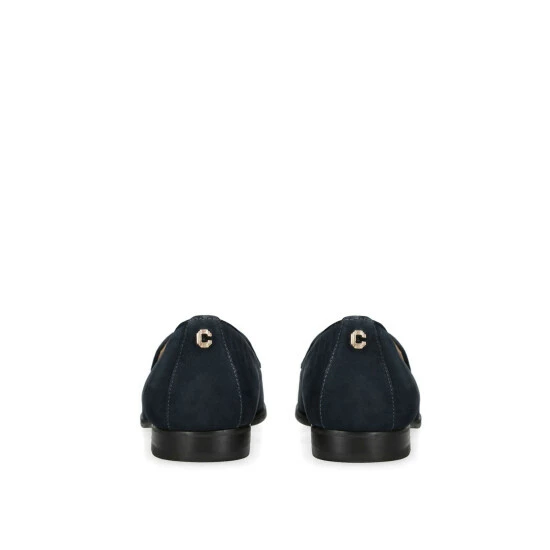 The Legend is a flat shoe featuring a soft navy suede exterior. The back of the ankle features a small, gold tone Icon C stud. This product features ‘All Day Long’ technology.