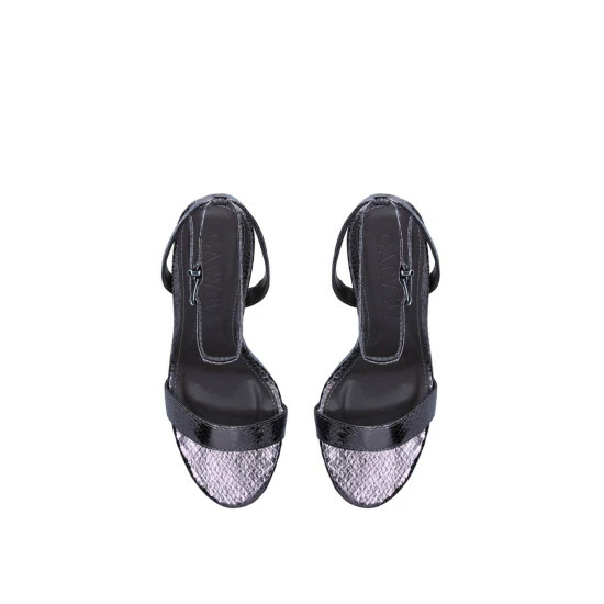 The Locked Sandal features a snake embossed upper and stiletto heel in gunmetal. The ankle strap is fastened with gunmetal buckle that is elevated with padlock charm. Heel height: 110mm. This style features ‘All Day Long’ technology to provide comfort from AM to PM (and beyond). Material: Leather alternative. Style number: 9297164979.