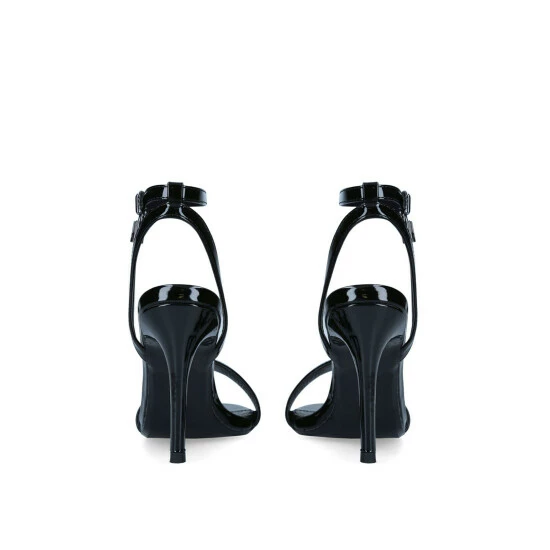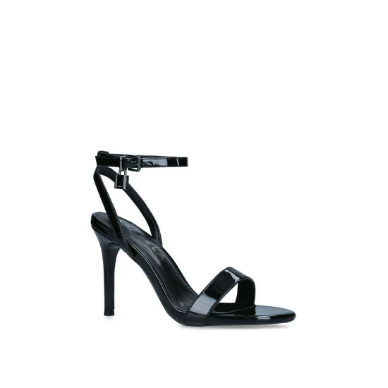 The Locked Sandal arrives in a black shiny patent design. The ankle strap is fastened with gunmetal buckle featuring embossed branded padlock. Heel height: 110mm.