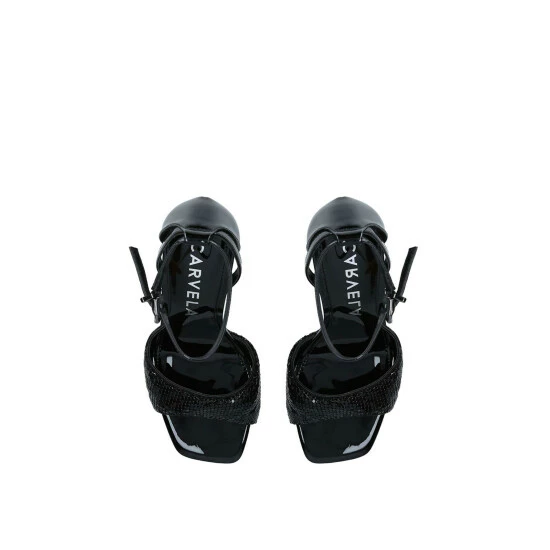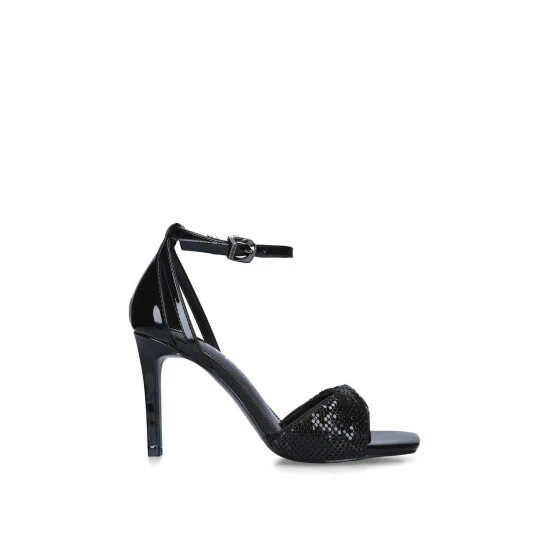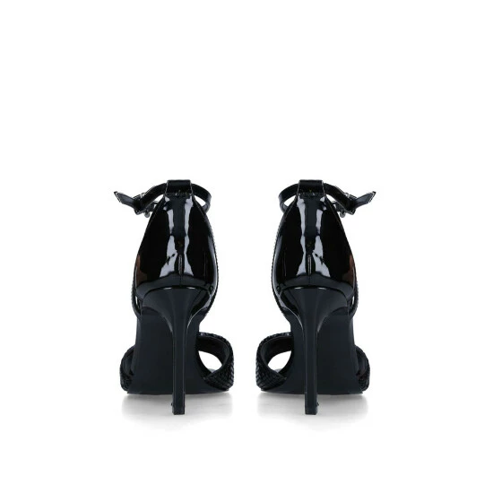 The Protect heel arrives in patent black with chainmail toe strap. The ankle is fastened with gunmetal buckle. Heel height: 90mm.