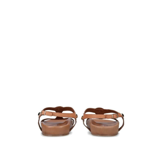 The Saz 2 sandals features a gray and tan brown leather sole and brass rounded studs across the strap. The ankle is fastened with metal buckle.