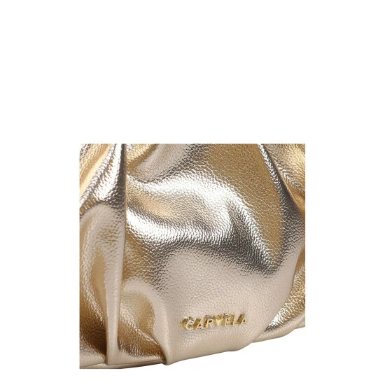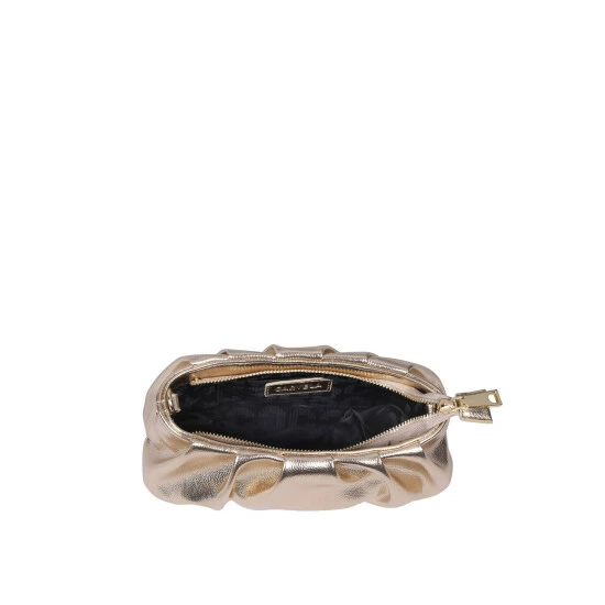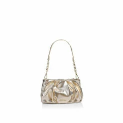 Trend forward, the Scrunch Clutch is designed in metallic gold with gold branding on the front. There is an optional shoulder strap with gold chain detail. Gold chain detail. 12cm (H), 22cm (L), 7cn (D) Strap drop: 44cm