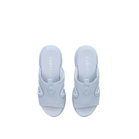 The Serene Sandals by Carvela feature a pale blue mesh strap with cut out details. The front is topped with pull tab and rubber Triple C logo.
