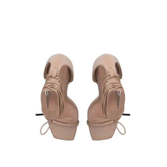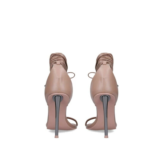 The blush Sharp Tie heels are sat on a 105mm stiletto heel in a gunmetal effect. The ankle is tied by exaggerated strappy straps. The toe is in a square style with padding at the arch and heel for comfort.