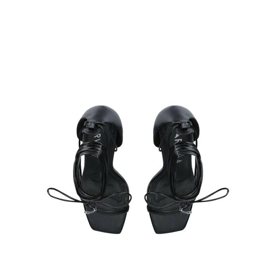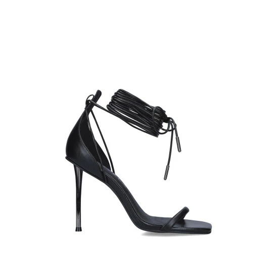 The black Sharp Tie heels are sat on a 105mm stiletto heel in a gunmetal effect. The ankle is tied by exaggerated strappy straps. The toe is in a square style with padding at the arch and heel for comfort.