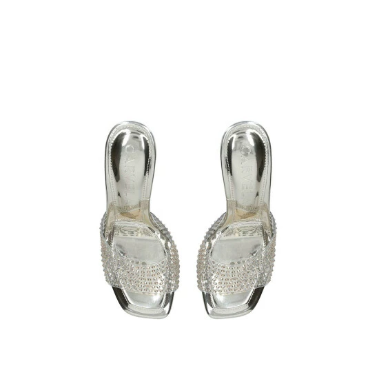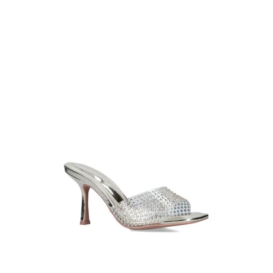 With a square toe, the Shimmer Mule features a clear vinyl strap across the toe. The gold footbed is padded at the ankle and arch for support. The thin heel sits at 85mm.