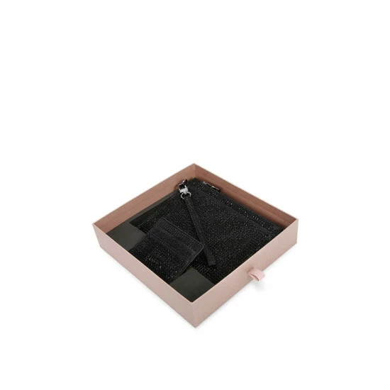 The Signature Wristlet arrives with a larger, zipped pouch in black that is embellished with crystals. There is a smaller card wallet with crystal embellishment.