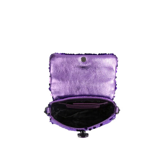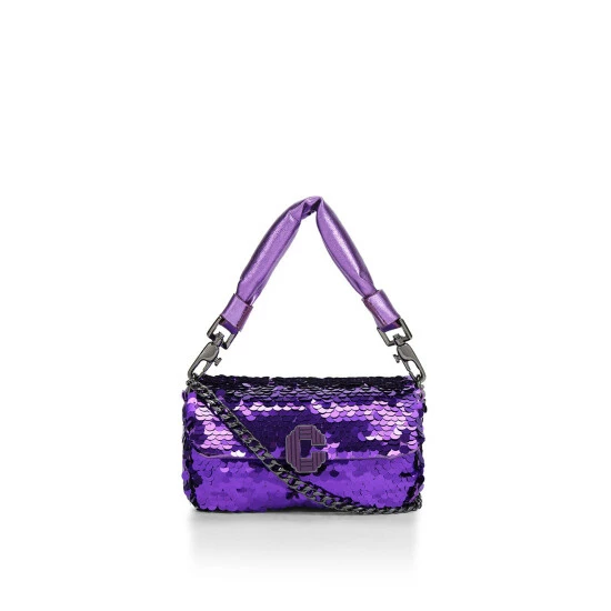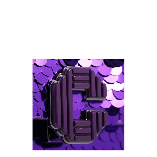 The Softy Mini arrives embellished in purple sequins. The front flap is fastened with purple signature C branding. The back of the bag features a flat pocket.
