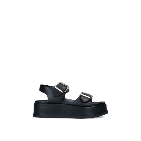 The Solace sandals are crafted from a black leather. There are two straps across the foot with large brushed gold buckles. The footbed is curved for comfort.