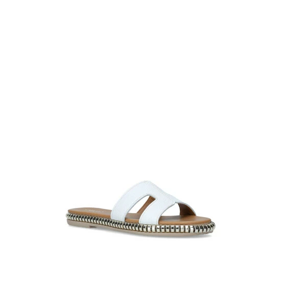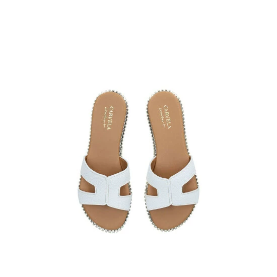 Introducing the Sophia sandals from Carvela Comfort. The white foot strap features cut outs and lighter stitching detail sat on a padded footbed. The flat sole features gold studded detail around the edge.