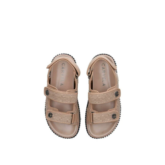 The blush Stage sandals have a woven effect upper with three velcro straps around the foot. The two top straps are topped with gunmetal Triple C logo matching the chain detail on the sole.