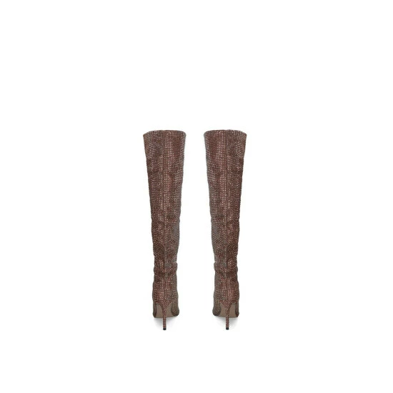 The Stand Out Boot from Carvela has a brown fabric upper embellished in silver jewels around the exterior.