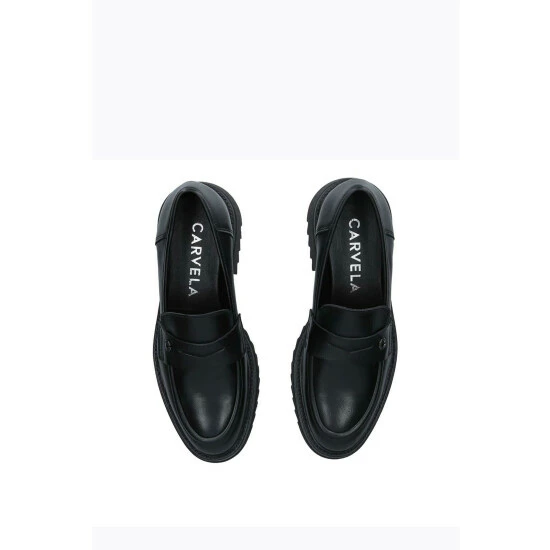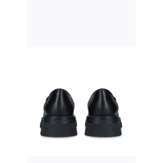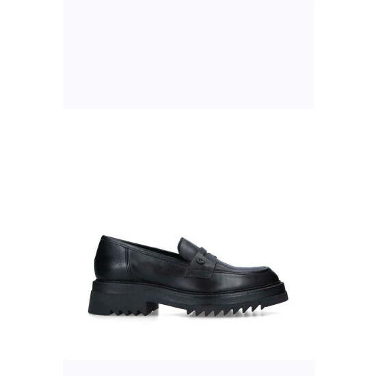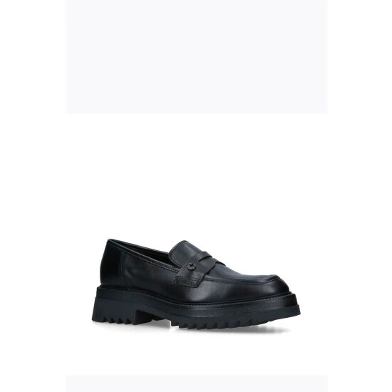 The Strong loafer from Carvela features a black patent upper with a black leather strap across the front. With a rigged chunky black sole.