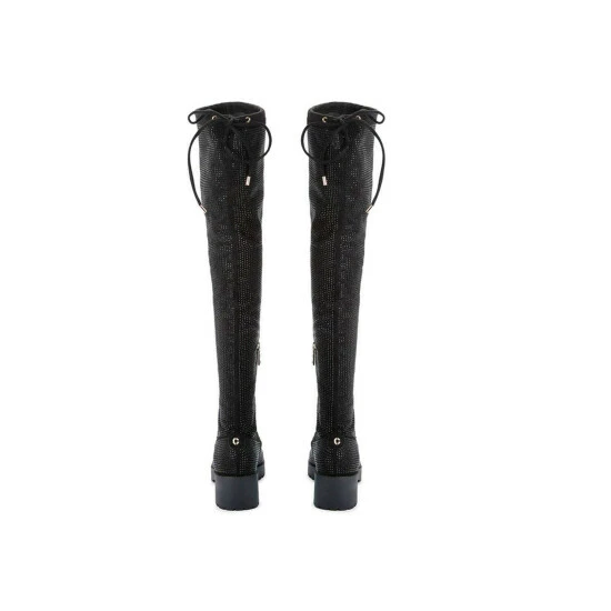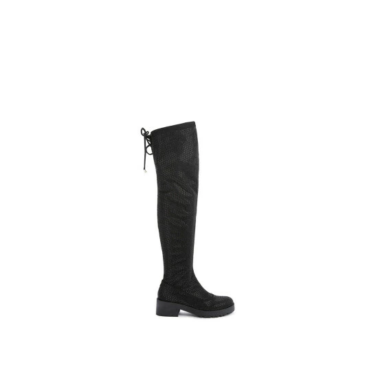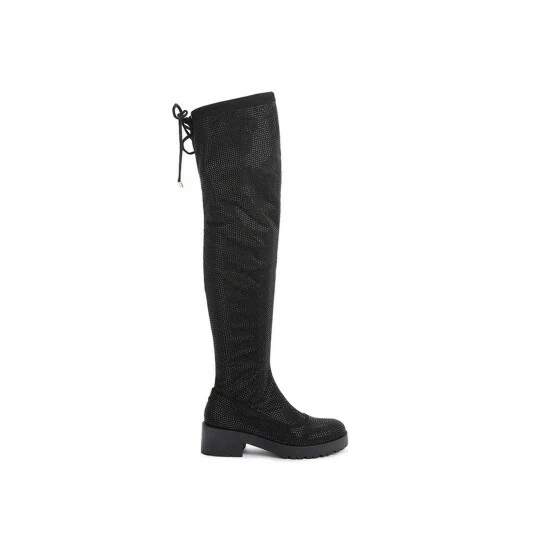 The Tammy Over The Knee boot is crafted from a black microsuede with crystal embellishment. There is a tie at the back of the ankle.