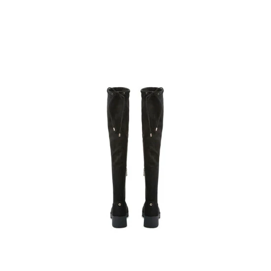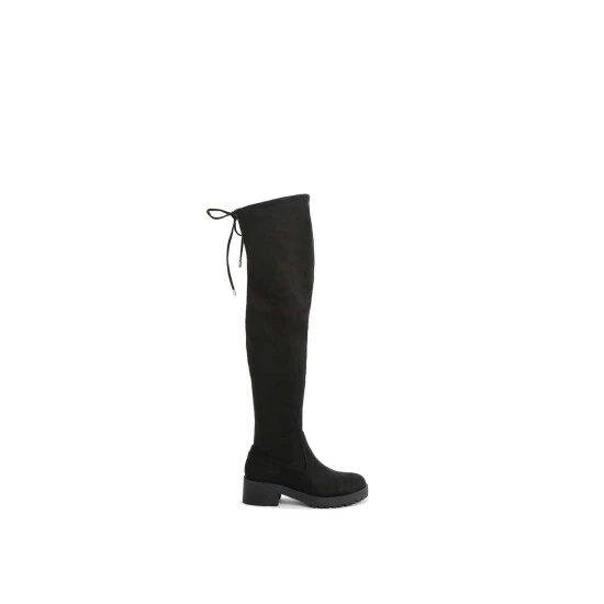 The Tammy Over The Knee boot is crafted from a black microsuede. There is a tie at the back of the ankle.
