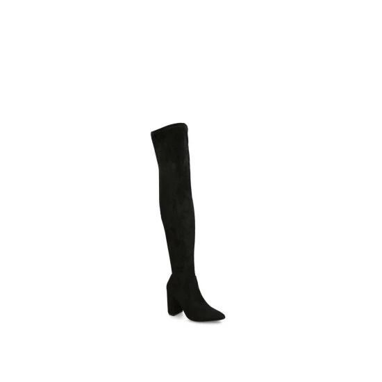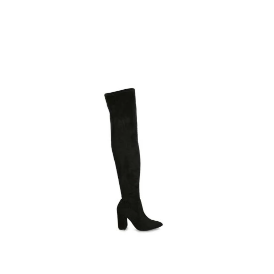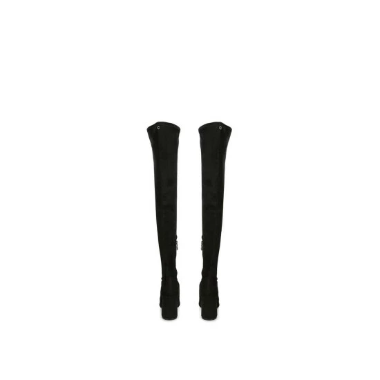 The Vivi is a knee high boot in a black microsuede. The back of the high ankle features a small gunmetal Icon C pin. The heel is in a block style. Heel Height: 90mm.